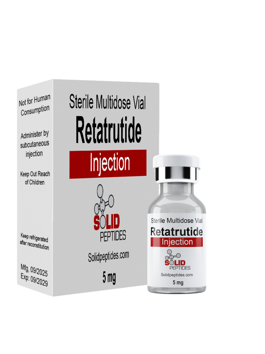 Retatrutide (LY3437943) is a first-in-class 39-amino acid synthetic peptide functioning as a triple agonist of GIPR (EC₅₀ 0.064 nM), GLP-1R (EC₅₀ 0.775 nM), and GCGR (EC₅₀ 5.79 nM). Developed by Eli Lilly on a GIP backbone with C20 fatty diacid conjugation, retatrutide enables once-weekly dosing with ~6-day half-life. Research (>100 publications spanning Phase 1-3 trials) demonstrates the highest weight loss efficacy of any single pharmaceutical agent: Phase 2 obesity trial (NEJM 2023) achieved 24.2% mean body weight reduction at 48 weeks with 83% of participants achieving ≥15% weight loss. Phase 2 MASLD substudy (Nature Medicine 2024) showed 82.4% liver fat reduction with 86% achieving normal liver fat (<5%). Phase 2 T2D trial (Lancet 2023) demonstrated -2.02% HbA1c reduction with 16.94% weight loss. Cryo-EM structures (2.68-3.26 Å) reveal continuous alpha-helical conformation with receptor-specific ECL1 interactions. Triple agonism creates synergistic effects: GLP-1R-mediated appetite suppression, GCGR-mediated thermogenesis/energy expenditure, GIPR-mediated nutrient partitioning.